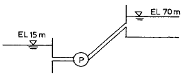 관의 마찰 및 기타 손실수두를 양정고의 10%로 가정할 경우 펌프의 동력을 마력으로 구하면? (단, 유량은 Q=0.07m3/s 이며, 효율은 100%로 가정한다.)