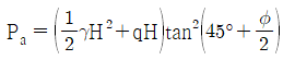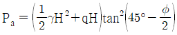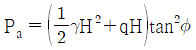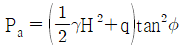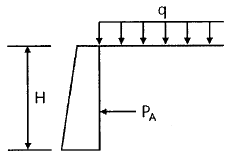 그림과 같이 수평지표면 위에 등분포하중 q가 작용할 때 연직옹벽에 작용하는 주동토압의 공식으로 옳은 것은? (단, 뒤채움 흙은 사질토이며, 이 사질토의 단위중량을 γ, 내부마찰각을 ø 라 한다.)