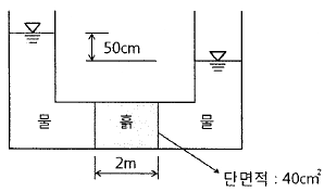 그림에서 흙의 단면적이 40cm2 이고 투수계수가 0.1cm/s 일 때 흙 속을 통과하는 유량은?