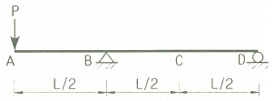 L이 10m인 그림과 같은 내민보의 자유단에 P=2t의 연직하중이 작용할 때 지점 B와 중앙부 C점에 발생되는 모멘트는?