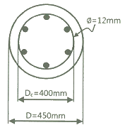 그림과 같은 나선철근 기둥에서 나선철근의 간격(pitch)으로 적당한 것은? (단, 소요나선철근비(ρs)는 0.018, 나선철근의 지름은 12 mm, Dc는 나선철근의 바깥지름)