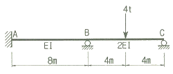 다음의 부정정 구조물을 모멘트 분배법으로 해석하고자 한다. C점이 롤러지점임을 고려한 수정강도계수에 의하여 B점에서 C점으로 분배되는 분배율 fBC를 구하면?