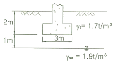 아래 그림과 같은 3m×3m 크기의 정사각형 기초의 극한지지력을 Terzaghi 공식으로 구하면? (단, 내부마찰각(ø)은 20°, 점착력(c)은 5 t/m2, 지지력계수 Nc=18, Nγ=5, Nq=7.5 이다.)
