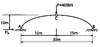그림과 같은 3힌지 아치의 C점에 연직하중(P) 400kN이 작용한다면 A점에 작용하는 수평반력(HA)은?