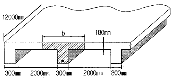 아래 그림과 같은 철근콘크리트 보-슬래브 구조에서 대칭 T형보의 유효폭(b)은?