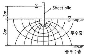 그림과 같은 지반내의 유선망이 주어졌을 때 폭 10m에 대한 침두 유량은? (단, 투수계수(K)는 2.2×10-2㎝/이다.)