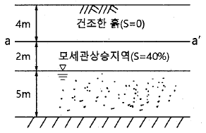 그림에서 a-a′면 바로 아래의 유효응력은? (단, 흙의 간극비(e)는 0.4, 비중(Gs)은 2.65, 물의 단위중량은 9.81kN/m3이다.)