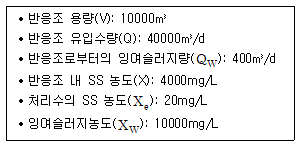 일반활성슬러지 공정에서 다음 조건과 같은 반응조의 수리학적 체류시간(HRT) 및 미생물 체류시간(SRT)을 모두 올바르게 배열한 것은? (단, 처리수 SS룰 고려한다.)