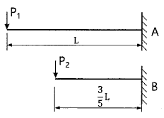 재질과 단면이 동일한 캔틸레버 보 A와 B에서 자유단의 처짐을 같게 하는 P2/P1의 값은?
