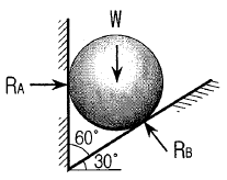 그림과 같이 밀도가 균일하고 무게가 W인 구(球)가 마찰이 없는 두 벽면 사이에 놓여있을 때 반력 RB의 크기는?