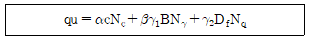 얕은 기초에 대한 Terzaghi의 수정지지력 공식은 아래의 표와 같다. 4m×5m의 직사각형 기초를 사용할 경우 형상계수 α와 β의 값으로 옳은 것은?