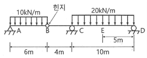 아래 그림과 같은 게르버 보에서 E점의 휨모멘트 값은?