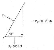 그림과 같은 삼각형 물체에 작용하는 힘 P1, P2를 AC면에 수직한 방향의 성분으로 변환할 경우 힘 p의 크기는?