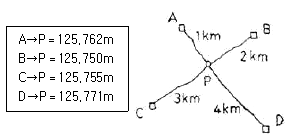 그림과 같이 4개의 수준점 A, B, C, D에서 각각 1km, 2km, 3km, 4km 떨어진 P점의 표고를 직접 수준 측량한 결과가 다음과 같을 때 P점의 최확값은?