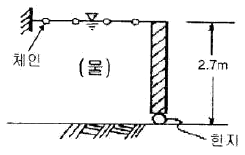 폭 4.8m, 높이 2.7m의 연직 직사각형 수문이 한쪽 면에서 수압을 받고 있다. 수문의 밑면은 힌지로 연결되어 있고 상단은 수평체인(Chain)으로 고정되어 있을 때 이 체인에 작용하는 장력(張力)은? (단, 수문의 정상과 수면은 일치한다.)