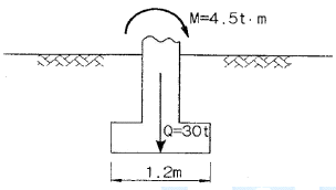 아래 그림과 같은 폭(B) 1.2m, 길이(L) 1.5m인 사각형 얕은 기초에 폭(B) 방향에 대한 편심이 작용하는 경우 지반에 작용하는 최대압축응력은?