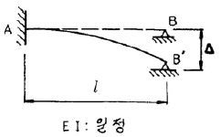 다음 그림과 같이 A지점이 고정이고 B지점이 힌지(hinge)인 부정정보가 어떤 요인에 의하여 B지점이 Bʹ로 만큼 침하하게 되었다. 이때 Bʹ의 지점반력은?