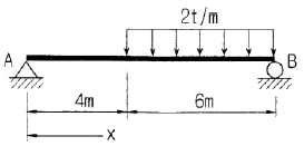 그림과 같은 단순보에서 최대휨모멘트가 발생하는 위치 x(A점으로부터의 거리)와 최대휨모멘트 Mx는?