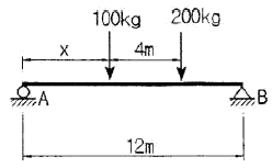 다음 그림과 같은 보에서 두 지점의 반력이 같게 되는 하중의 위치(x)를 구하면?