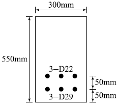 그림과 같은 직사각형 단면의 보에서 인장철근은 D22철근 3개가 윗부분에, D29철근 3개가 아랫부분에 2열로 배치되었다. 이 보의 공칭 휨강도(Mn)는? (단, 철근 D22 3본의 단면적은 1161mm2, 철근 D29 3본의 단면적은 1927mm2, fck=24MPa, fy=350MPa)