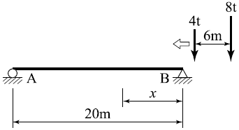 그림과 같이 2개의 집중하중이 단순보 위를 통과할 때 절대최대 휨모멘트의 크기(Mmax)와 발생위치(x)는?