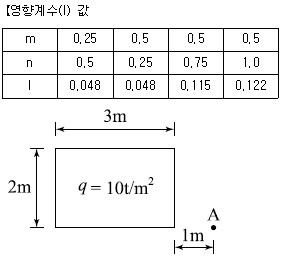 다음 그림과 같이 2m×3m 크기의 기초에 10t/m2의 등분포하중이 작용할 때, A점 아래 4m 깊이에서의 연직응력 증가량은? (단, 아래 표의 영향계수 값을 활용하여 구하며, m=B/z, n=L/z이고, B는 직사각형 단면의 폭, L은 직사각형 단면의 길이, z는 토층의 깊이이다.)