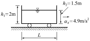 그림과 같이 높이 2m인 물통에 물이 1.5m만큼 담겨져 있다. 물통이 수평으로 4.9m/s2의 일정한 가속도를 받고 있을 때, 물통의 물이 넘쳐흐르지 않기 위한 물통의 길이(L)는?