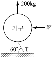 부양력 200kg인 기구가 수평선과 60°의 각으로 정지상태에 있을 때 기구의 끈에 작용하는 인장력(T)과 풍압(w)을 구하면?