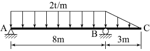 그림과 같은 내민보에서 정(+)의 최대휨모멘트가 발생하는 위치 x(지점 A로부터의 거리)와 정(+)의 최대휨모멘트(Mx)는?