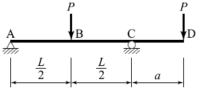 다음 내민보에서 B점의 모멘트와 C점의 모멘트의 절대값의 크기를 같게 하기 위한 L/a의 값을 구하면?