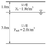 아래 그림과 같은 모래지반에서 깊이 4m 지점에서의 전단강도는? (단, 모래의 내부마찰각 ø = 30°이며, 점착력 C = 0)