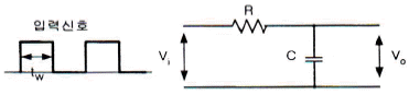 아래의 그림과 같은 RC 적분회로의 입력에 펄스폭이 tw인 구형파를 인가했을 때 회로의 시정수(τ=RC)가 τ≫tw의 조건이 되면 출력파형은 아래의 보기 중 어떤 모양인가?