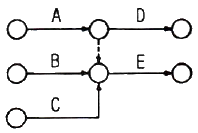 다음 그림의 AOA(Activity-on-Arc) 네트워크에서 E 작업을 시작하려면 어떤 작업들이 완료되어야 하는가?