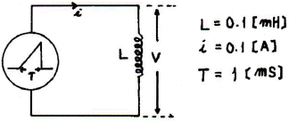 그림과 같은 회로에서 코일에 가해지는 삼각파 전류의 펄스폭(T)이 1ms인 경우 코일에 유도되는 기전력은 몇 V 인가?(단, 전류 i 는 최대값을 나타낸다.)