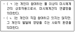 브론펜브레너(U. Bronfenbrenner)의 생태체계이론에 관한 설명이다. ( )의 내용으로 옳은 것은?