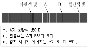 <보기 1>은 어떤 기체를 방전관에 넣고 전압을 걸어 방전시켰을 때 나온 빛을 분광기로 관찰한 결과이다. A와 B 중 하나는 노란색 빛을, 다른 하나는 초록색 빛을 나타낼 때, 이에 대한 설명으로 옳은 것을 <보기 2>에서 모두 고른 것은?