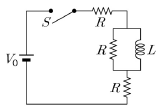 유도기, 저항, 기전력원, 스위치를 그림과 같이 연결하여 회로를 구성한 후 스위치를 닫아 회로에 전류가 흐르기 시작했다. 스위치를 닫은 후 충분히 오랜 시간이 지나 일정한 크기의 전류가 회로에 흐르게 되었을 때, 유도기에 저장된 에너지는? (단, 인덕턴스(inductance), 저항, 기전력의 크기는 L, R, V0이다.)