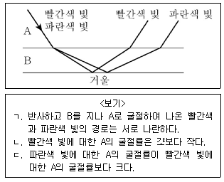 그림은 매질 A에서 같은 경로로 입사하여 매질 B를 지나 거울에서 반사한 빨간색 빛과 파란색 빛의 경로를 나타낸 것이다. B에서 두 빛에 대한 매질의 굴절률은 n으로 같다. A와 B의 경계면은 거울 면과 나란하다. <보기>에서 이에 대한 설명으로 옳은 것을 모두 고른 것은?