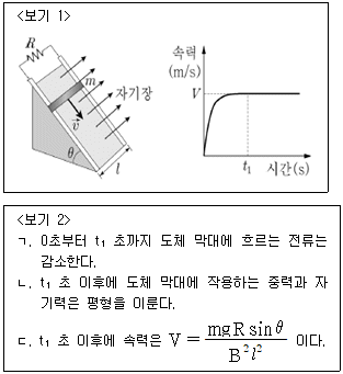 <보기 1>과 같이 경사각이 θ인 빗면에 수직 방향으로 균일한 자기장이 형성되어 있다. 이 빗면에 저항 R이 연결된 도선을 놓고 그 위에 도체 막대를 가만히 올려 놓아 미끄러져 내려가게 한 후, 시간에 따른 도체 막대의 속력 그래프를 얻었다. 도체 막대의 길이는 ㅣ이고 질량은 m이며, 자기장의 세기는 B 이다. t1초 이후에 도체 막대가 등속운동을 한다고 할 때, <보기 2>에서 옳은 설명을 모두 고른 것은? (단, 모든 마찰은 무시하고, 도선과 도체 막대의 전기 저항도 저항 R에 비해 매우 작다고 가정하여 무시한다. 또한 중력가속도는 g라 한다.)