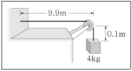<보기>는 밀도가 균일한 줄에 질량이 4kg인 추를 매달아 벽과 도르래 사이에 걸쳐둔 모습을 나타낸 것이다. 줄의 총 질량은 1kg이고 총 길이는 10m이다. 벽과 도르래를 연결하는 줄에서 파동의 속력[m/s]은? (단, 중력가속도는 10m/s2이며, 도르래의 마찰과 질량은 무시한다.)