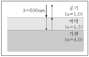 <보기>는 굴절률이 4.0 인 기판에 무반사 박막을 코팅한 모습을 나타낸 것이다. 박막의 굴절률이 1.5 일 때, 파장 600nm인 빛의 반사를 최소화하기 위한 박막의 최소두께 [mm]는?