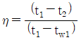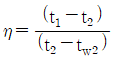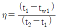 에어와셔 단열 가습시 포화효율(η)은 어떻게 표시하는가? (단, 입구공기의 건구온도 t1, 출구공기의 건구온도 t2, 입구공기의 습구온도 tw1, 출구공기의 습구온도 tw2 이다.)