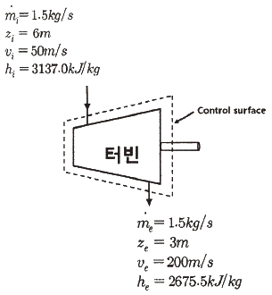 증기터빈에서 질량유량이 1.5kg/s 이고, 열손실율이 8.5kW이다. 터빈으로 출입하는 수증기에 대하여 그림에 표시한 바와 같은 데이터가 주어진다면 터빈의 출력(kW)은 약 얼마인가?