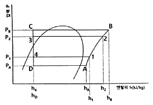다음 그림은 냉동사이클을 압력-엔탈피(P-h) 선도에서 나타낸 것이다. 다음 설명 중 옳은 것은/
