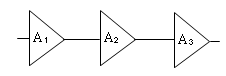 다음 각 단의 증폭기에서 A1= 26[dB], A2=19[dB], A3=4[dB]이라면 전체 증폭도는 얼마인가?