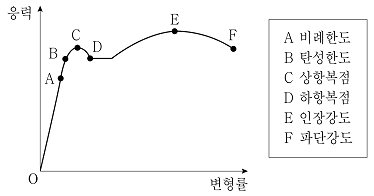 그림과 같은 연강의 응력-변형률 선도에서 훅(Hooke)의 법칙이 성립되는 구간은?