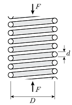 그림과 같이 코일스프링의 평균 지름 D[mm], 소선의 지름 d[mm]인 스프링의 중심축 방향으로 압축하중 [N]가 작용할 때, 스프링의 최대전단응력[N/mm2]으로 가장 옳은 것은?