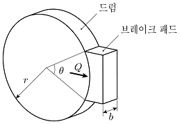 그림과 같은 브레이크 드럼의 반지름(r) 50mm, 접촉중심각(θ) 60°, 폭(b) 20mm인 블록 브레이크에 1,000N의 하중(Q)이 작용할 때, 브레이크 패드가 받는 압력[N/mm2]은?