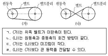 평벨트를 벨트풀리에 거는 방법에 대한 설명으로 옳은 것만을 모두 고르면? (단, 원동축은 시계방향으로 회전한다)