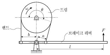 그림과 같이 드럼축에 토크 M이 작용하여 드럼이 시계방향으로 돌고 있다. 밴드와 드럼 사이의 마찰계수가 μ이고 접촉각이 θ일 때, 드럼을 정지시키기 위해 밴드와 연결된 브레이크 레버에 작용시켜야 할 최소 힘 F는? (단, b=2a이다)
